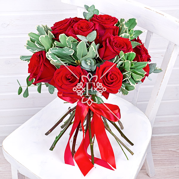 Насыщенно-алая роза  символизирует  глубокую любовь, привязанность и страсть, а так же уважение и восхищение. В обрамлении зелени эвкалипта  и питтоспорума – букет смотрится великолепно и стильно!